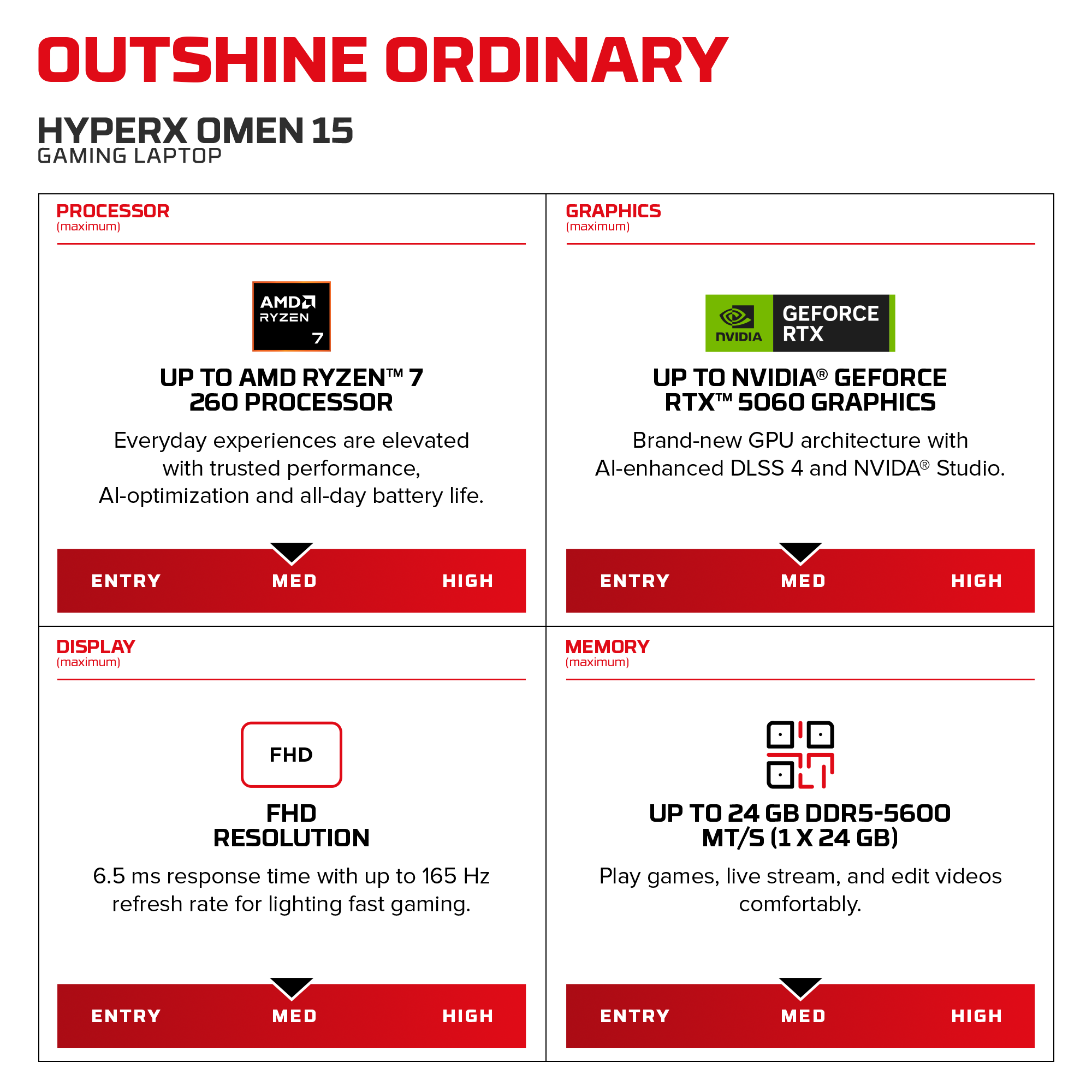 HyperX OMEN 15 sets the standards for 15 inch gaming laptops with an experience that sets itself apart. Play your favorite games at high settings and maximize FPS with OMEN AI. You’ll feel that performance on a vivid, fast refresh rate display and our newest 8000 Hz hyper polling rate keyboard that gives you the competitive edge with up to 34% faster inputs [4].Then when the match gets tough, you are in control with NVIDIA® GeForce RTX™ 50 Series GPUs and up to an AMD Ryzen™ AI 7 450 processor [1] that go further with Unleashed Mode, where you can manually overclock your device.