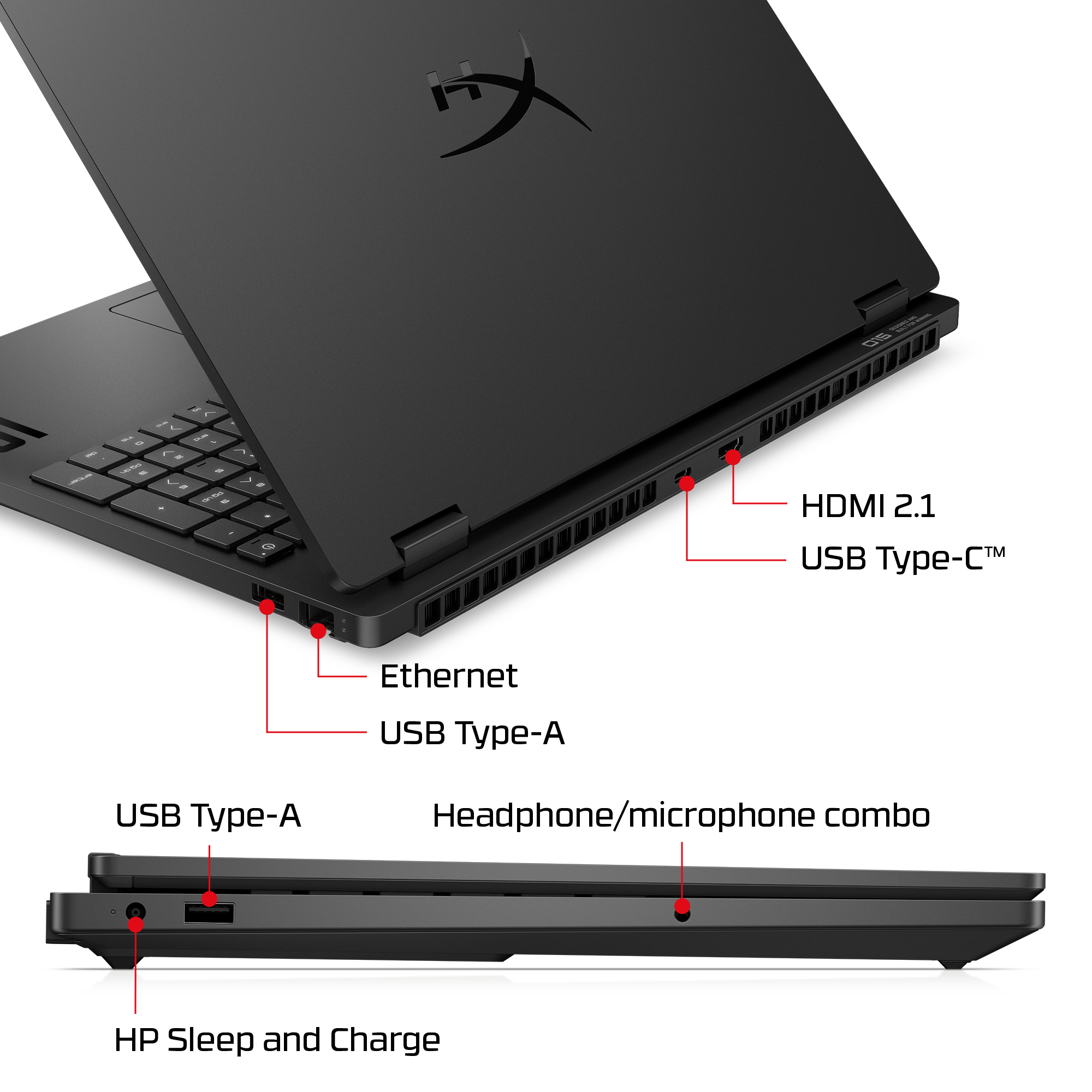 External I/O Ports: 2 USB Type-A 10Gbps signaling rate; 1 AC smart pin; 1 HDMI-out 2.1; 1 headphone/microphone combo; 1 RJ-45; 1 USB Type-C® 10Gbps signaling rate (USB Power Delivery 3.1, DisplayPort™ 1.4, HP Sleep and Charge) [19,42]